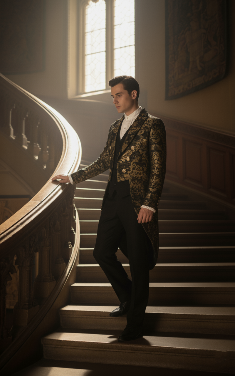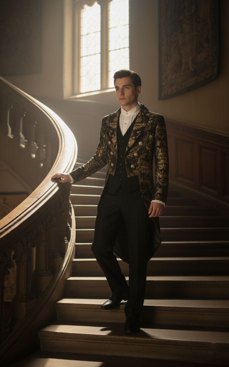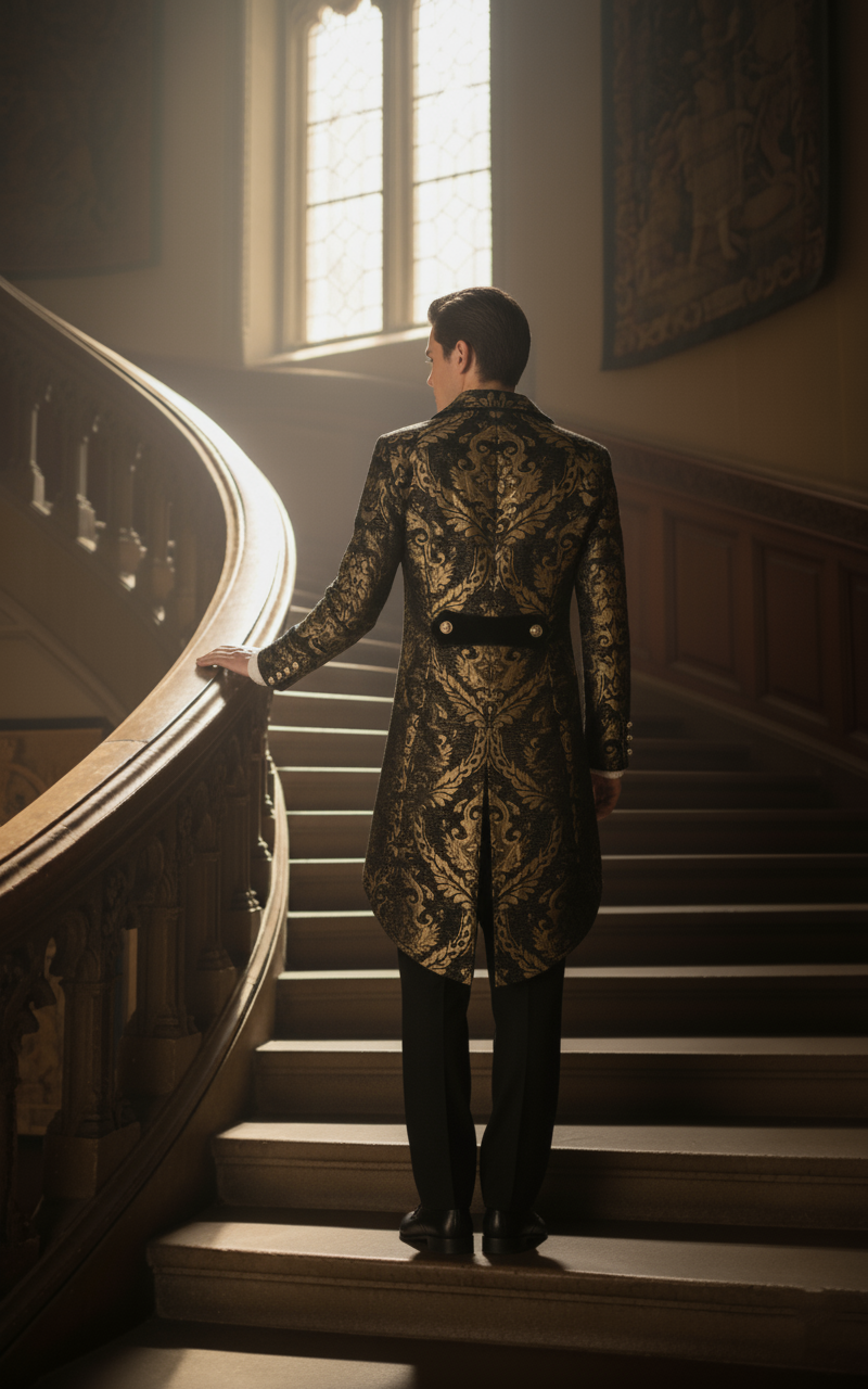 Frak dworski to wyjątkowy element męskiej garderoby, który od razu przenosi w czasy dawnych bali i uroczystości arystokratycznych. Ten złoto-czarny frak to połączenie luksusu i elegancji – na tle czarnego materiału pojawia się wyrazisty złoty wzór, który nadaje mu prawdziwie królewski charakter. To nie jest zwykłe ubranie, ale prawdziwa ozdoba, która sprawia, że każdy mężczyzna wyróżnia się w tłumie.