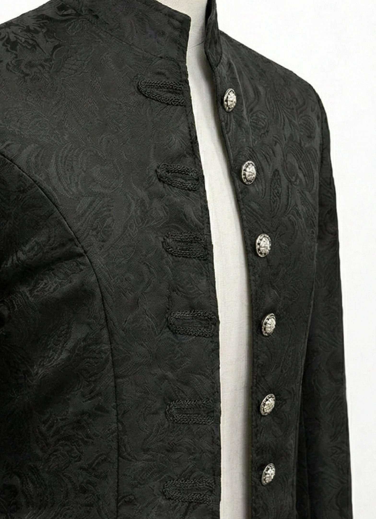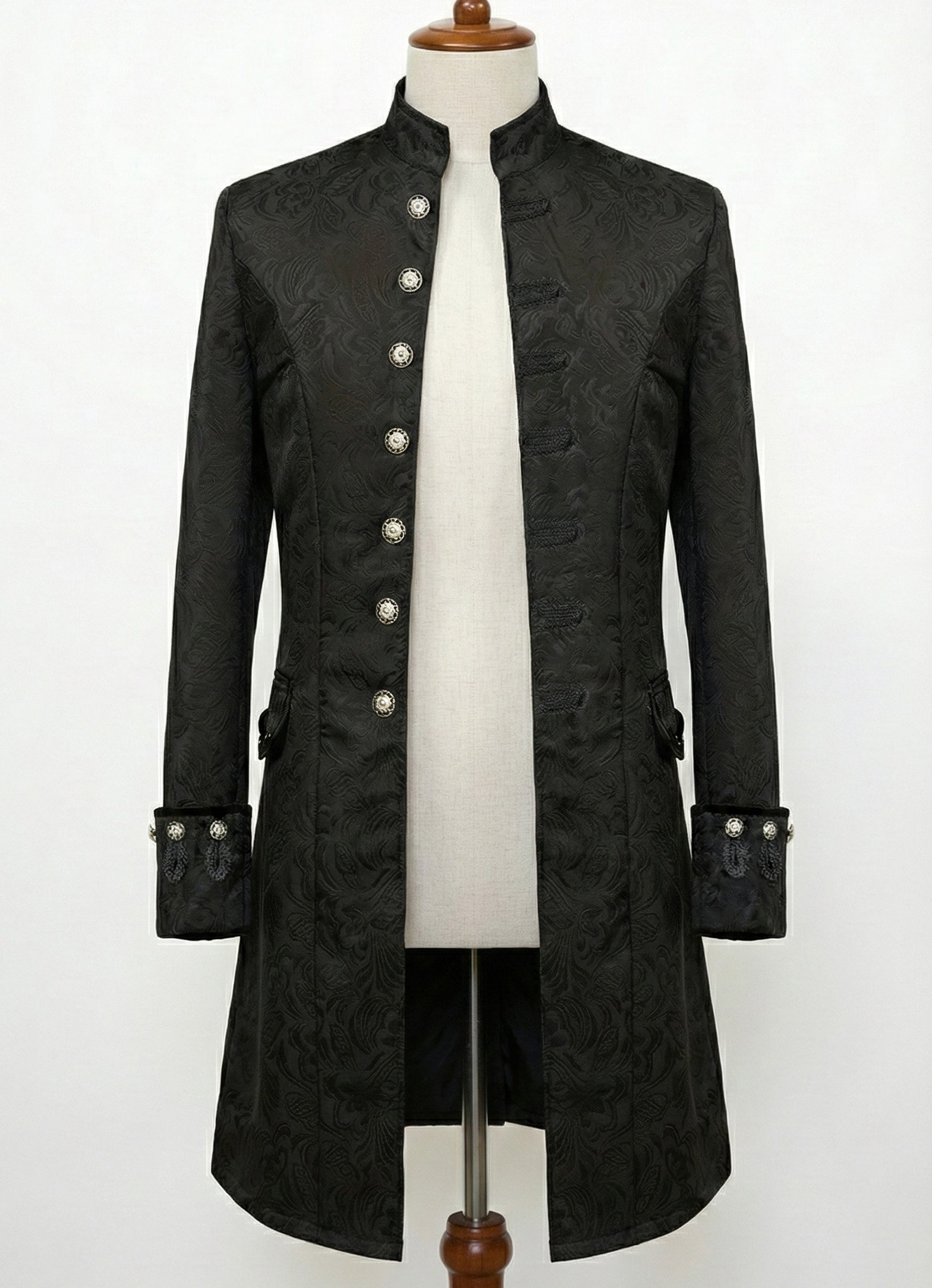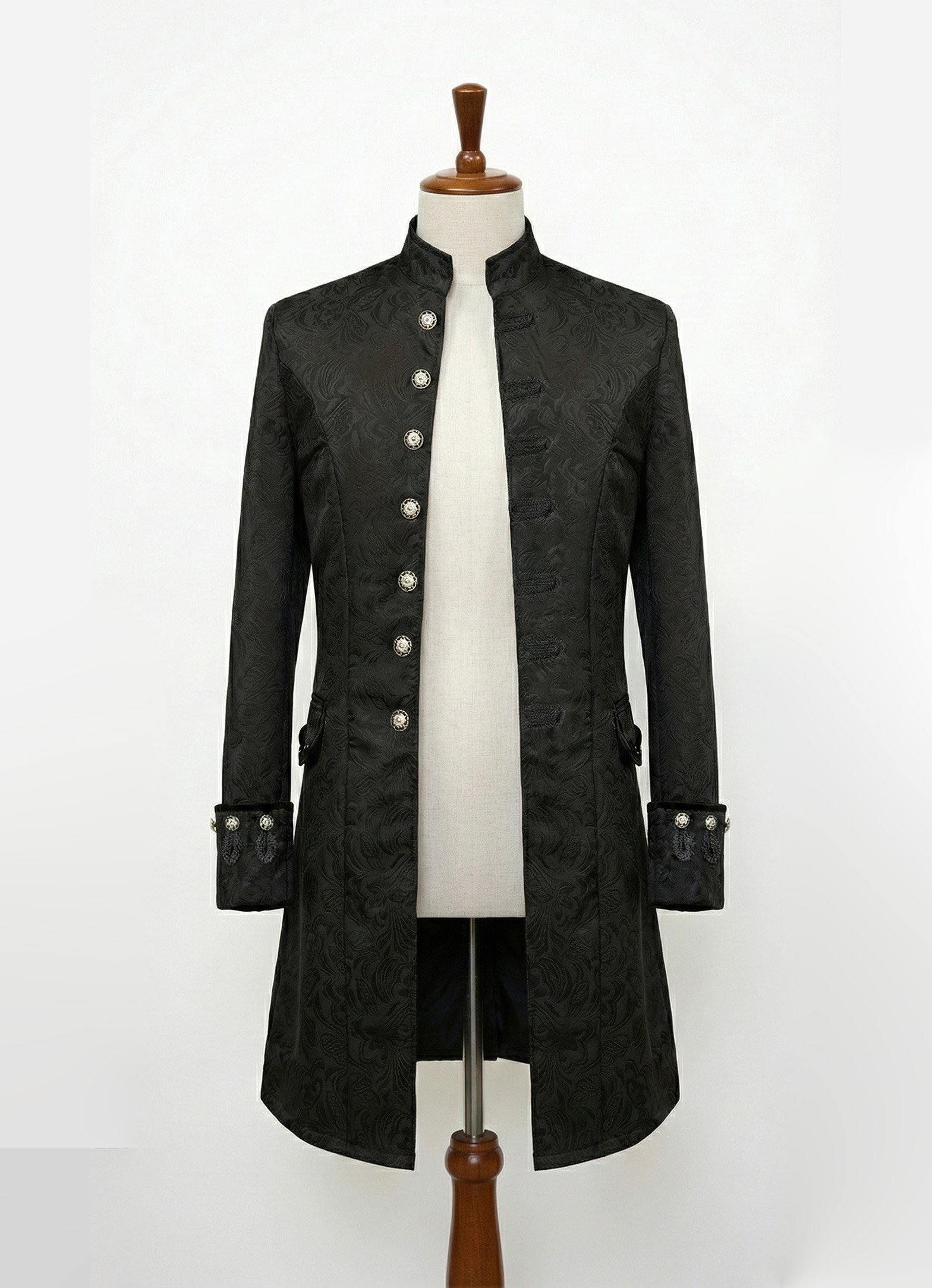 This men’s Gothic-style tailcoat is distinguished by its unique cut, decorative details, and high-quality craftsmanship. The long back, fitted waist, and elegant cuffs give this tailcoat a truly striking look. It’s the perfect outfit for balls, themed weddings, photo shoots, and special events where a man wants to stand out with his style.