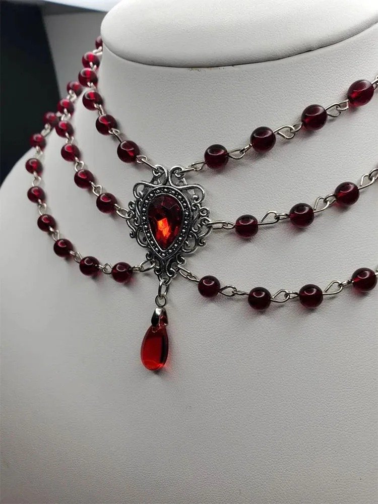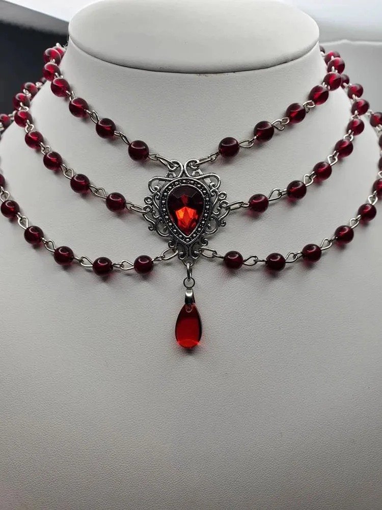 Ten naszyjnik vintage w stylu wiktoriańskim inspirowany jest biżuterią noszoną przez damy dworu w XIX wieku. Cechowały ją bogate zdobienia, finezyjne wzory i staranne wykonanie – wszystko to znajdziesz także w tym modelu. Połączenie czerwieni z ciemnymi tonami tworzy wyrafinowany kontrast, który idealnie oddaje ducha epoki: pełen emocji, ale też klasycznej elegancji.